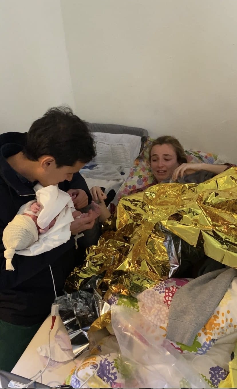 Elle arrive dans la chambre, toujours en ligne avec les pompiers et là, elle regarde entre mes jambes, elle bugge, elle dit juste aux pompiers « le bébé est là, il y a la tête, venez ! » et elle raccroche.