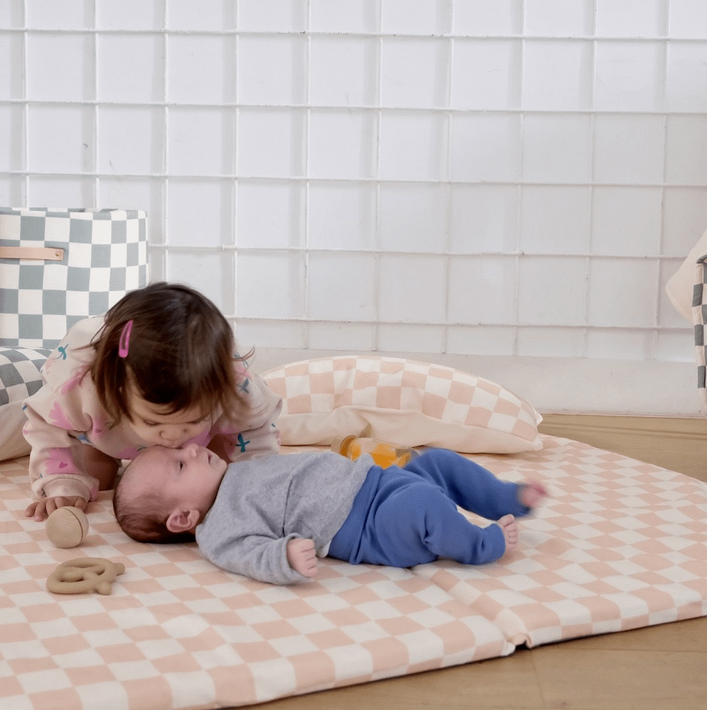 - Un tapis d’éveil, type Mézamé : idéal pour passer un peu de temps au sol, s’entrainer à rouler bouler, ou se lire des histoires pour les temps calmes !